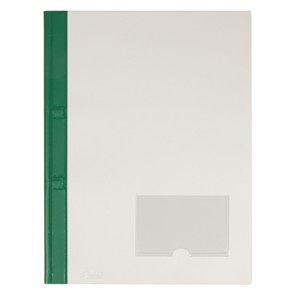 Vorder- und Rückendeckel aus grauer Hartfolie, Rücken aus farbiger Hartfolie, mit Schlaufenheftung. Vorderdeckel unten rechts mit einem transp. Einschubfenster, 3-seitig verschweisst, oben offen, mit Daumen- stanzung, für Beschriftungsetikett (je 10 mm vom Rand), mit lose beigefügten Beschriftungseinlagen |