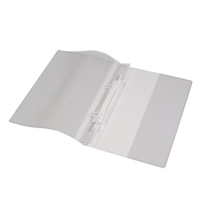 Vorder- und Rückseite aus transp. Weichfolie 0,20 mm, Vorderseite mit ganzflächiger Tasche, Rückseite mit einer Längstasche, zur Mechanik hin offen, mit herausziehbarer Abheftvorrichtung.