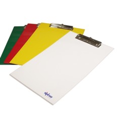 Folie weiß - 0,40 mm - Verstärkt mit 100 % Recycling-Maschinengraupappe. Auf der Vorderseite eine aufgenietete Klemme (323) mit Aufhängung 120 mm breit. Rückseitig mit transparenter Tasche (kpl. Breite, 305 mm hoch - oben, Schmalseite offen) |